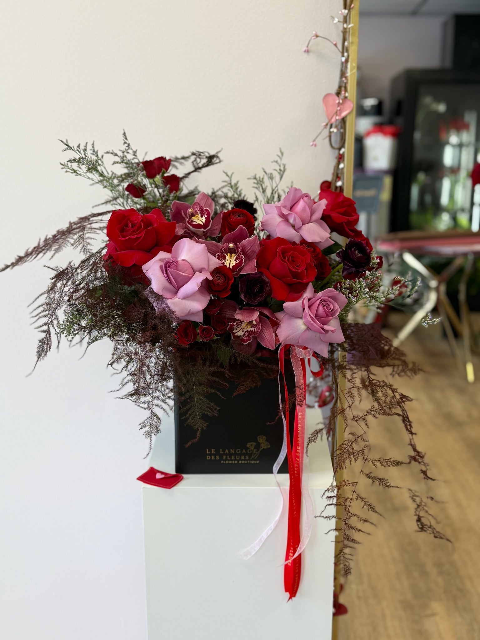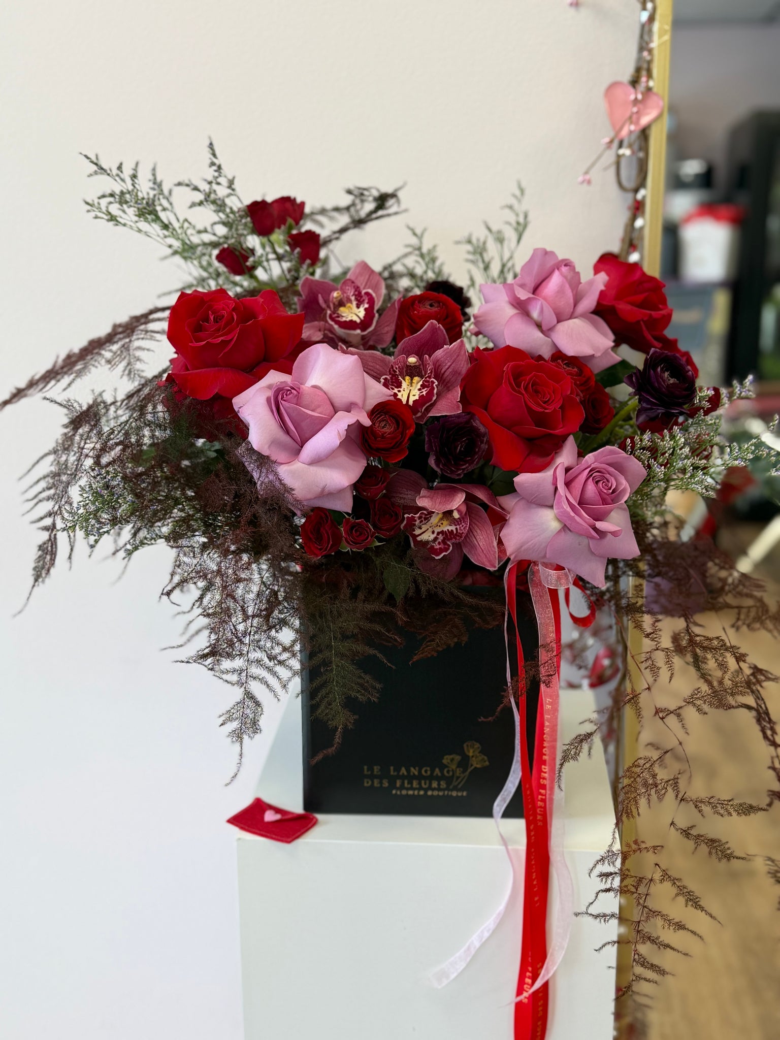 Medium black square box with red painted greenery, 8 red and purple roses, 10 red spray roses, 3 orchids, 6 ranunculus and limonium-perfect arrangement for any occasion.