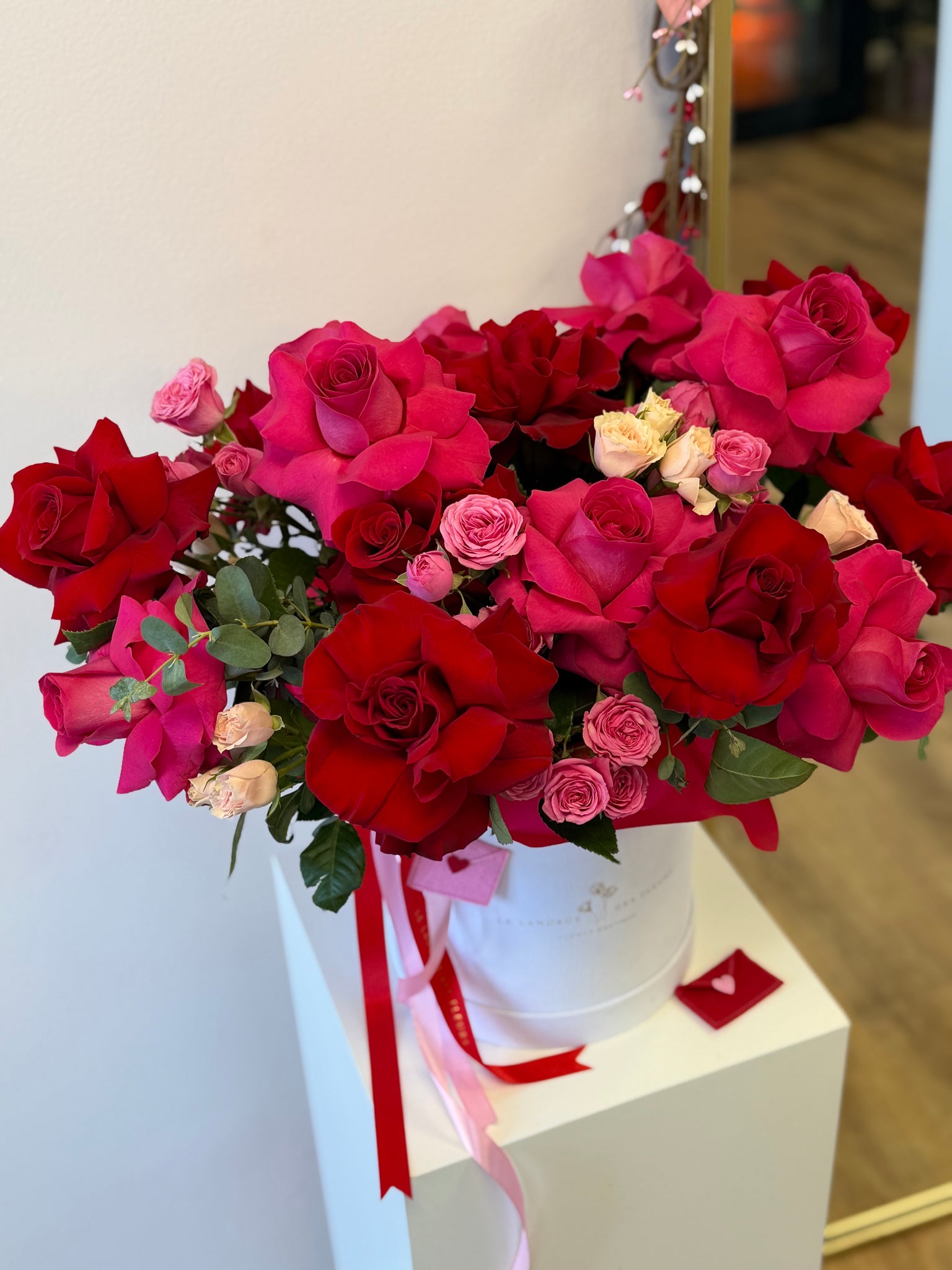 Medium size white velvet box with 18 hot pink and red Ecuadorian roses, 12 white and pink spray roses, gunni eucalyptus. Perfect gift for any occasion.