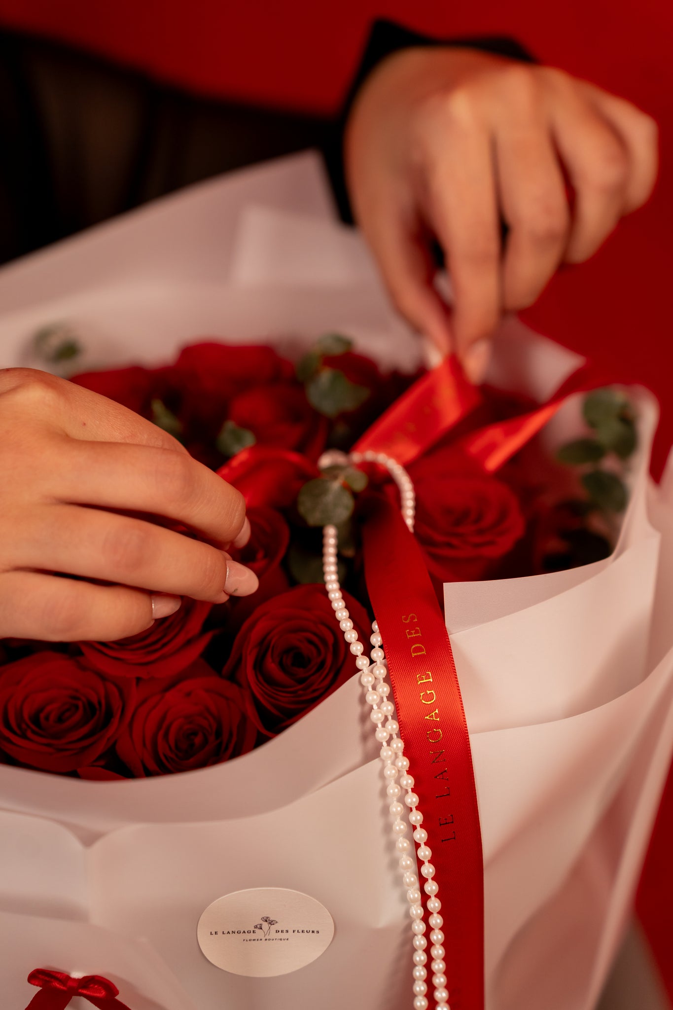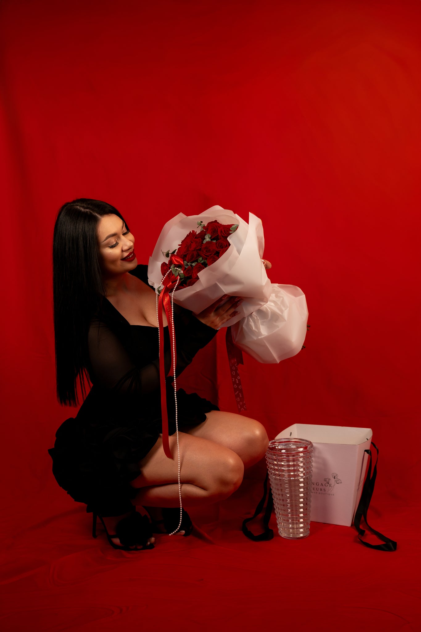 25 red Ecuadorian roses 60 cm long with eucalyptus in craft paper. Vase and box for transportation included.