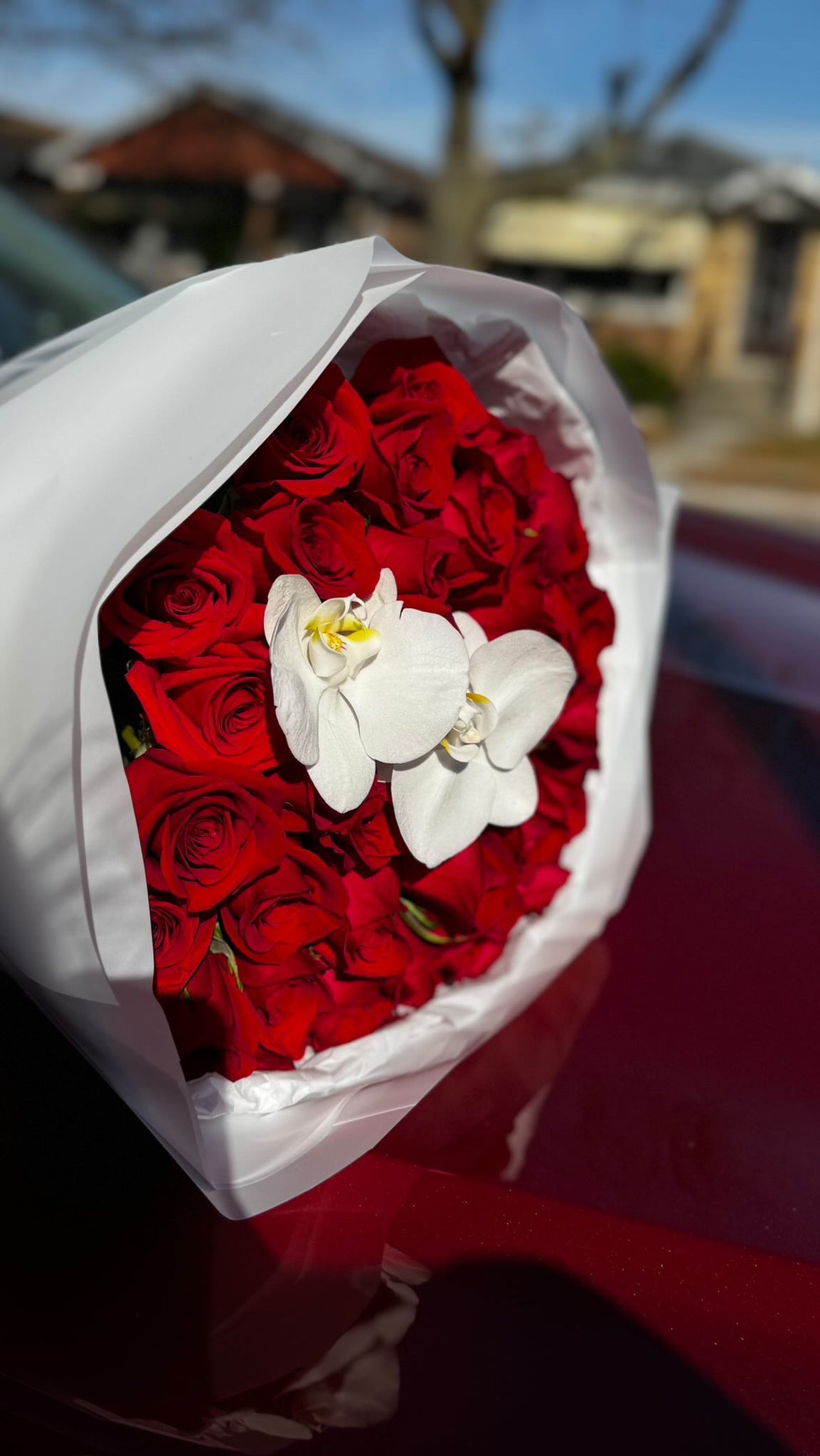 35 red Ecuadorian roses 60 cm long with 2 orchids in white paper- your best arrangement for any occasion